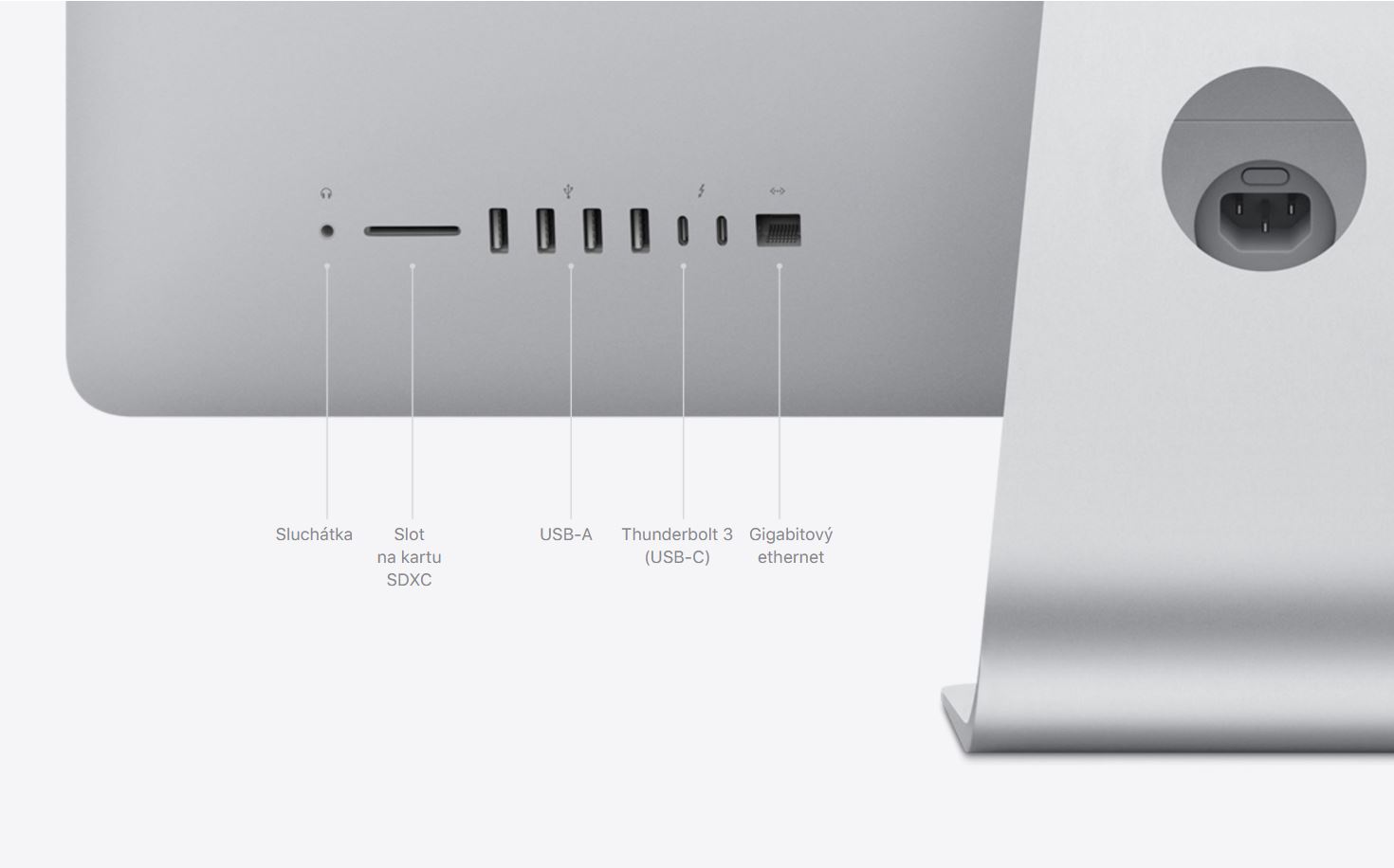 Plno portů. Plno možností. Každý iMac má ultrarychlá rozhraní Wi-Fi a Bluetooth, dva superrychlé porty Thunderbolt 3 (USB-C), čtyři porty USB-A a port 1Gb ethernetu. Takže u něj máš spoustu vysoce výkonných konektorů na připojení externích disků, fotoaparátů, monitorů a dalších zařízení. 27palcový iMac si teď můžeš objednat i s 10Gb ethernetem, který je až desetkrát rychlejší než předchozí generace. A má Bluetooth 5.0 na okamžité připojení bezdrátových zařízení.