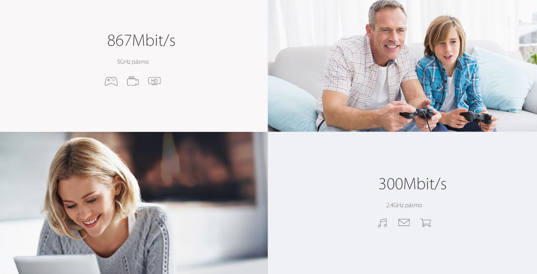Archer C1200 vytváří spolehlivou, bleskově rychlou síť pomocí silné Wi-Fi technologie 802.11ac. Nyní si můžete užívat streamování HD videa a hraní on-line her bez prodlev na volném pásmu 5GHz, zatímco pásmo 2.4GHz je využito na každodenní činnosti, jako jsou čtení e-mailů a prohlížení webů.