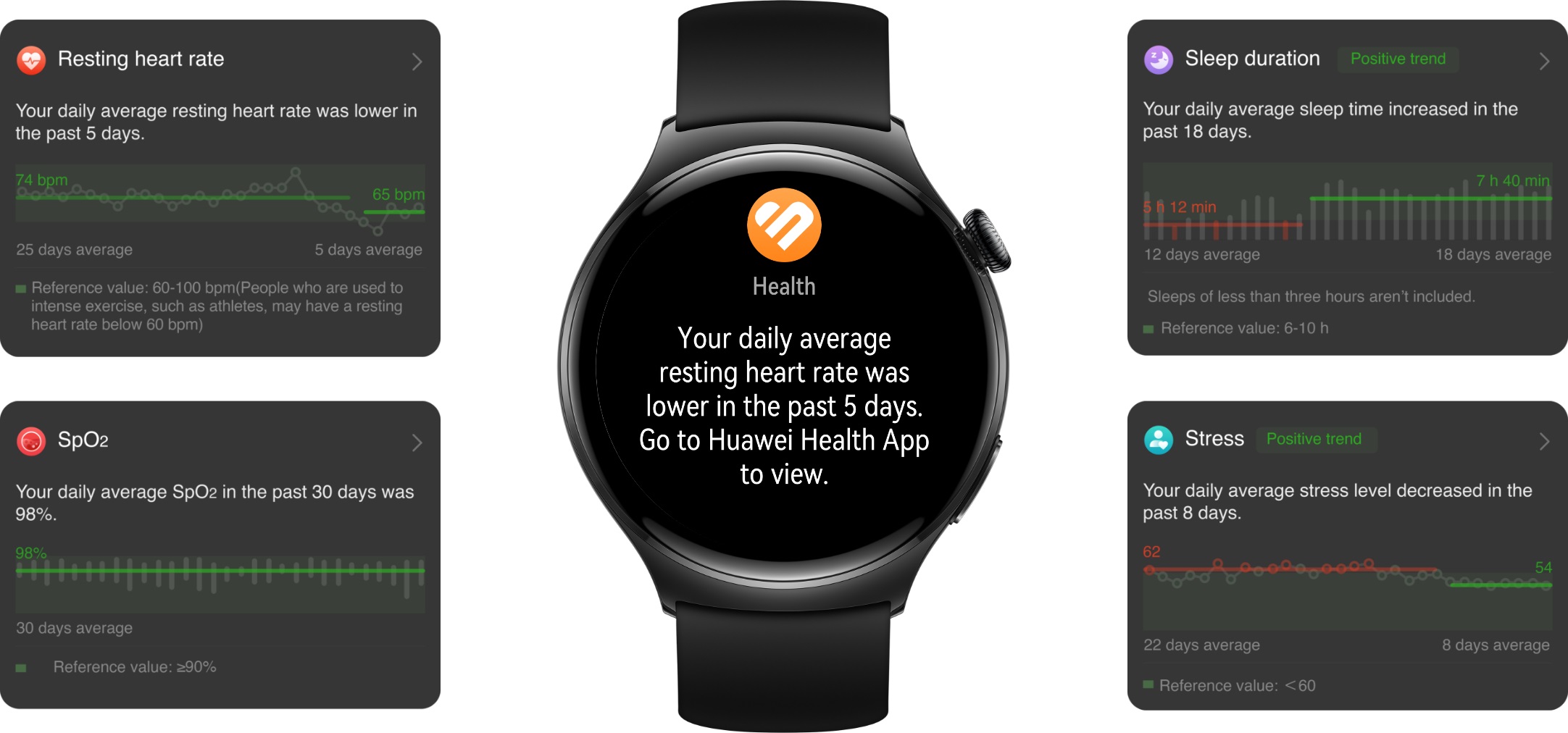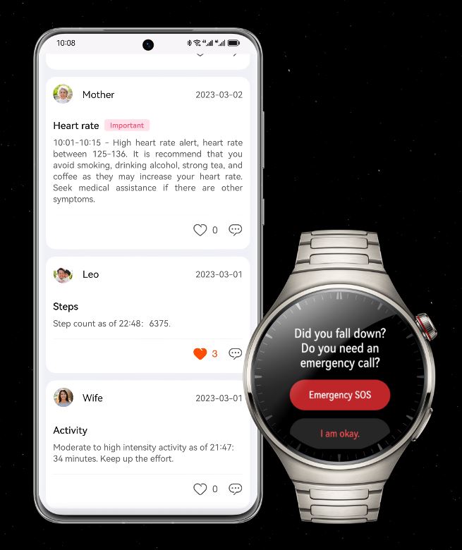Hodinky série WATCH 4 se postarají o celou rodinu. Hodinky upozorní vždy, když je srdeční frekvence a SpO2 rodinných příslušníků abnormální, a dokáží zjistit, zda některý člen rodiny není v pořádku, poskytnutím automatického kontextového okna nouzového volání