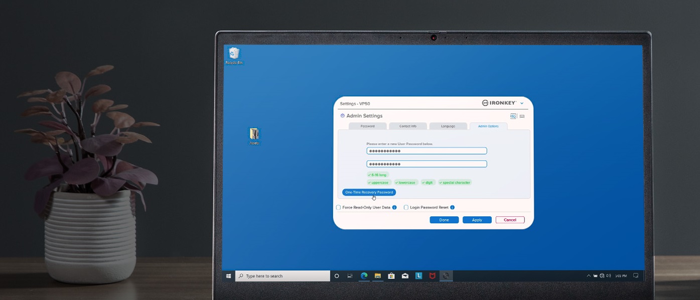 Povolte hesla správce, uživatele a jednorázové obnovení. Správce může resetovat heslo uživatele a vytvořit heslo pro jednorázovou obnovu, aby obnovil přístup uživatele k datům. Ochrana proti útokům hrubou silou zablokuje hesla User nebo One-Time Recovery při 10 nesprávných heslech zadaných v řadě a kryptografické vymazání jednotky, pokud je heslo Admin zadáno 10krát za sebou nesprávně.