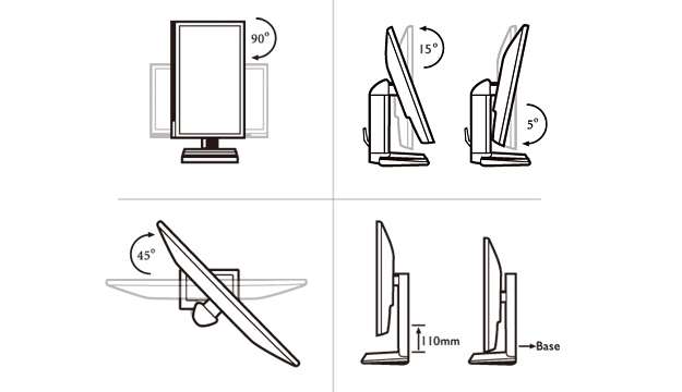 Výškově stavitelný stojan umožňuje nalézt nejlepší zorné úhly pro samostatnou práci či sdílení obrazovky, přičemž je k dispozici rozsáhlá řada nastavení monitoru – výška, naklonění, otočení (pivot), zdvih a natočení. Dolní část obrazovky může být nyní vzdálena 110 mm od základny.