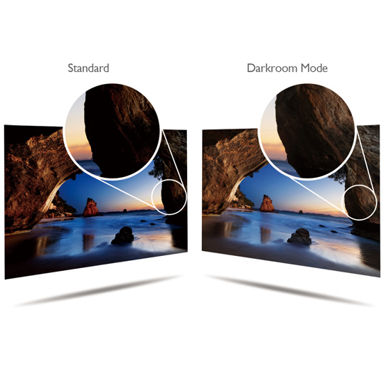 Režim Darkroom upravuje jas a kontrast obrazu, poskytuje zřetelné a ostré detaily a vytváří optimální nastavení pro práci v tmavém prostředí post-processsingu.