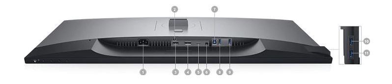 1. Konektor síťového napájení | 2. Zámek stojanu | 3. Port HDMI | 4. Vstup DisplayPort | 5. Port USB-C | 6. Zvukový výstup | 7. Port USB pro připojení k počítači (upstream) | 8. Port USB pro připojení periferních zařízení (downstream) | 9. Port USB pro připojení periferních zařízení s možností nabíjení | 10. Port USB pro připojení periferních zařízení (downstream) | 11. Port USB pro připojení periferních zařízení s možností nabíjení