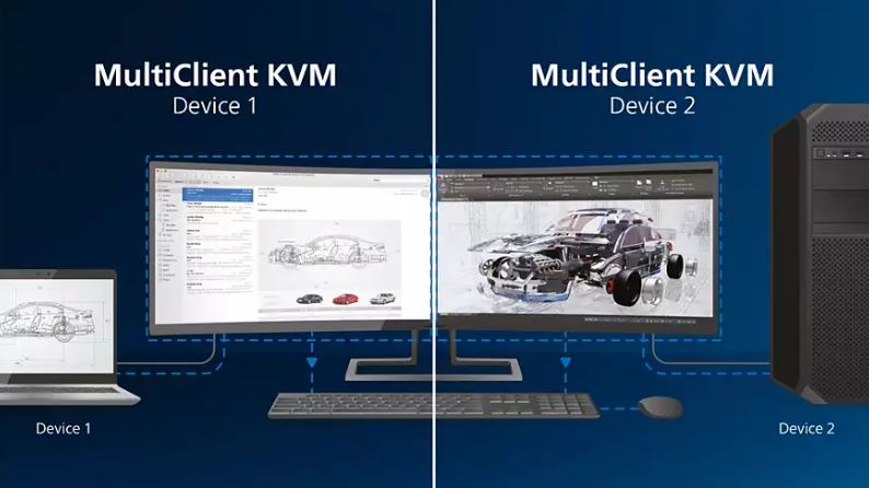 S integrovaným přepínačem KVM MultiClient můžete ovládat dva samostatné počítače s jedním nastavením monitoru, počítače a klávesnice. Praktické tlačítko umožňuje rychle přepínat mezi zdroji. To oceníte v případě nastavení vyžadujících výkon dvou počítačů nebo při sdílení jednoho velkého monitoru dvěma různými počítači.