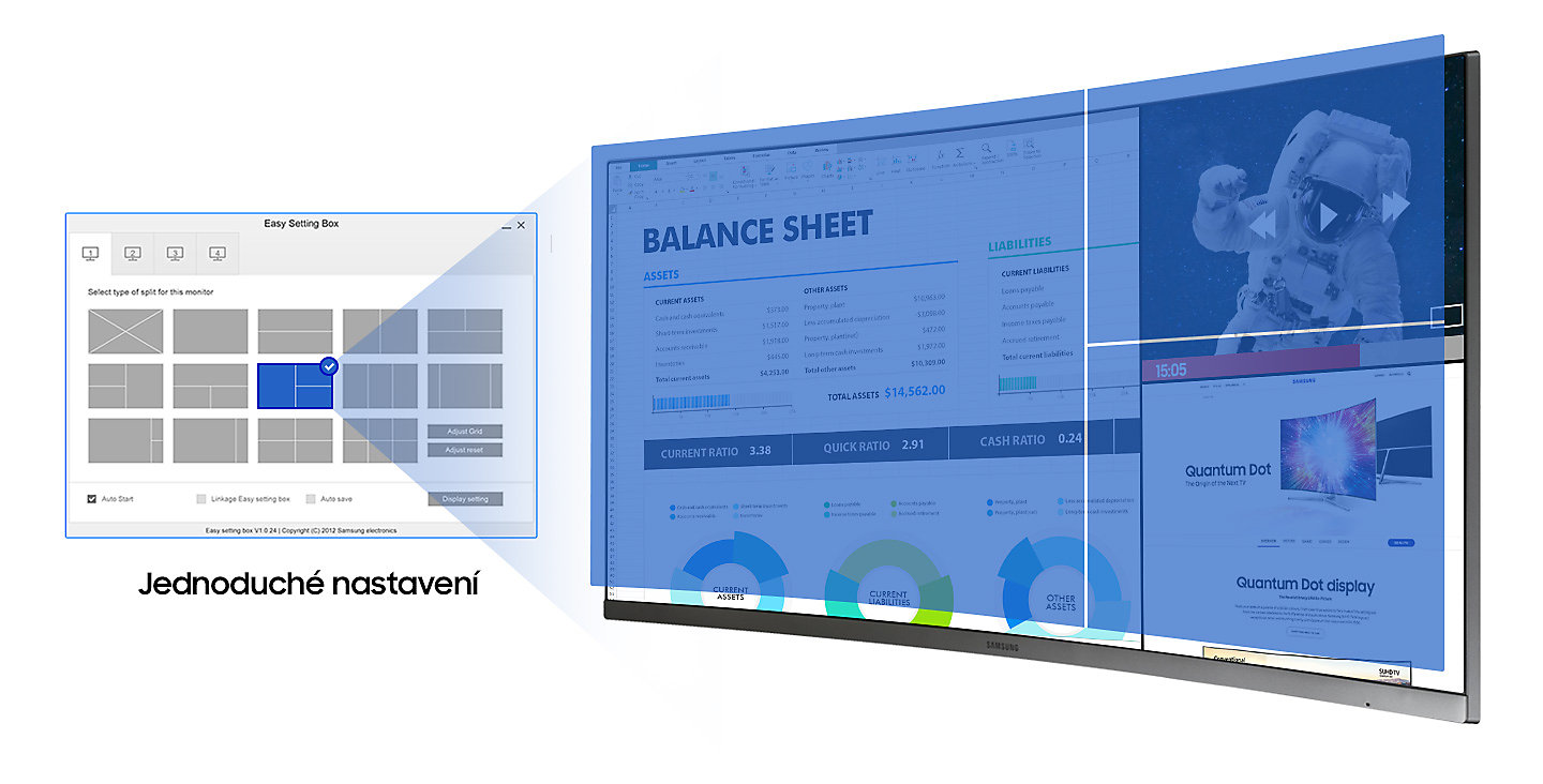 Software Easy Setting Box umožňuje jednoduché rozdělení obrazovky na více menších oken různých velití a jejich rozmístění do různých částí obrazovky. Funkce Picture-by-Picture navíc umožňuje zobrazení obsahu na obrazovce monitoru ze dvou odlišných zařízení. S monitorem SH85 tak zvládnete pracovat na více úlohách současně mnohem efektivněji a jednodušeji.