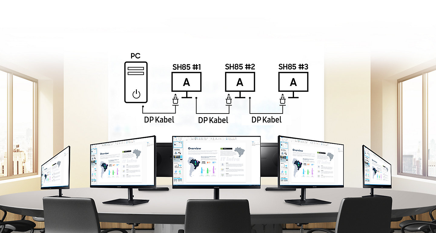 Využijte možnosti SH85 ke snadnému zrcadlení obrazu a řetězení dalších monitorů prostřednictvím jediného DisplayPort kabelu. Obsah z SH85 okamžitě zobrazíte na dalším displeji ve stejně vysoké kvalitě. Usnadníte tak například firemní konferenční komunikaci.