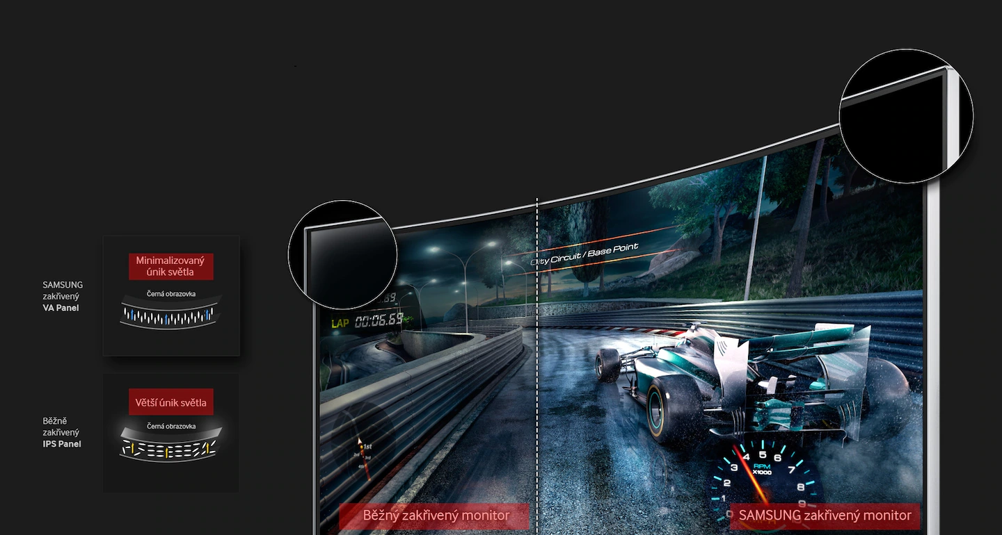 Vertikálně uspořádané tekuté krystaly VA panelu společnosti Samsung zabraňují podsvícení mnohem účinněji než IPS panely, takže křivka obrazovky minimalizuje únik světla a poskytuje hlubší a jednotnější černé na celé ploše obrazovky včetně jejích okrajů.