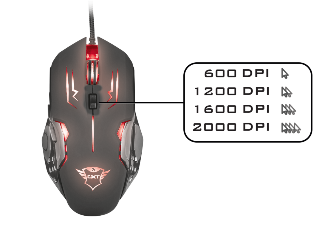 Od výstřelu ve střílečce po velení celé armády; s herní myší GXT 108 Rava s podsvětlením se budete valit herními mapami jako stroj. Tato myš vám umožní zvládnout jakoukoli situaci. Optický senzor GXT 108 vám poskytuje více než dostatečnou přesnost pro ostré střílení ve hře. Vyberte si ze 4 různých úrovní DPI, aby se tato myš přizpůsobila vašim preferencím. Pomocí tlačítka DPI můžete přepínat mezi 600, 1200, 1600 a 2000 DPI. Použijte nižší nastavení DPI pro přesnější výstřely a vyšší DPI pro rychlé reflexy a rychlé prozkoumání vašeho okolí.