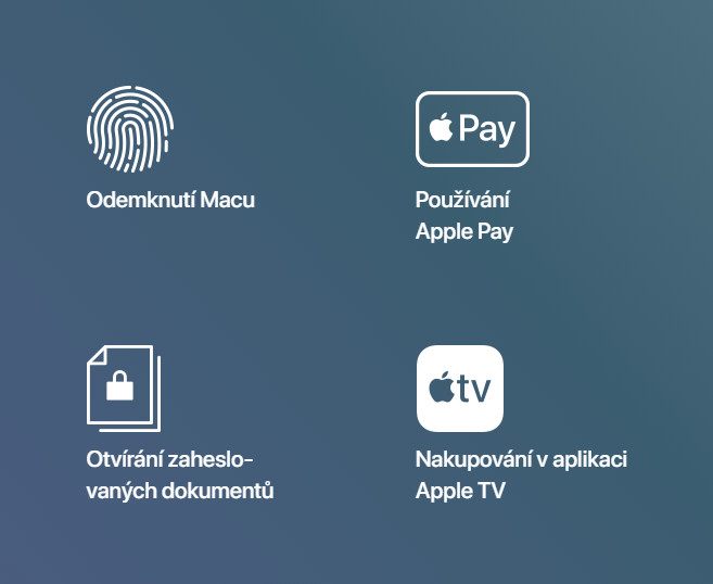 MacBook Air odemkneš i zamkneš jediným dotykem. Otiskem prstu potvrdíš zápůjčku filmu, nákup aplikace, přístup k zabezpečeným dokumentům nebo změny nastavení systému. Žádné opakované zadávání hesla. Při nákupu online pomocí Apple Pay se ti Touch ID postará o vyplnění dodacích a fakturačních údajů, aniž by obchodník dostal číslo tvojí platební karty.