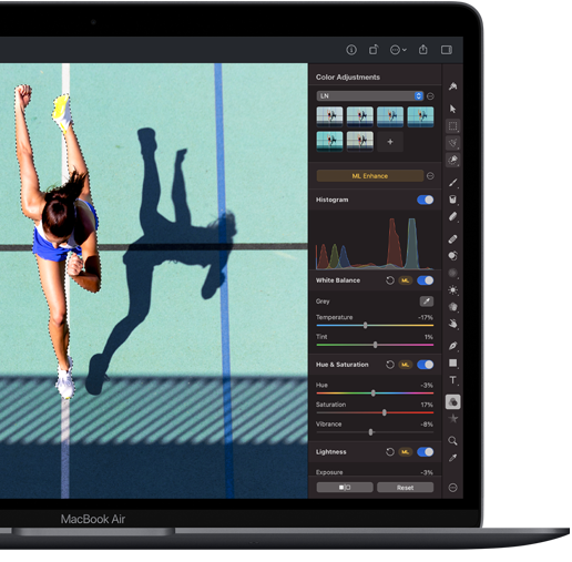 Až 9× rychlejší. To je hodně na zprocesování i pro 16jádrový Neural Engine. Aplikace na MacBooku Air můžou pomocí strojového učení (ML) automaticky retušovat fotky, pracovat s větší přesností automatického výběru u nástrojů nebo zvukových filtrů a zvládat i spoustu dalších úloh. Nejde jenom o výpočetní sílu – jde o sílu celého souboru ML technologií.