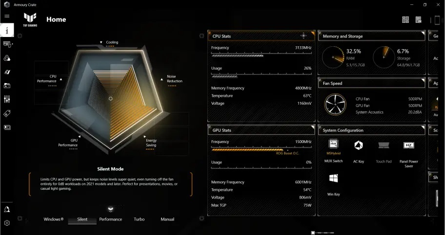 Software Armoury Crate spojuje ovládání systému a osvětlení v jediném, snadno použitelném nástroji. Jeho rozsáhlé možnosti nastavení umožňují přizpůsobit estetické efekty, vyladit herní profily a upravit nastavení zvuku podle vašich preferencí. Pomocí profilů scénářů můžete definovat a přizpůsobit předvolby, které automaticky upraví výkon a další možnosti při spuštění oblíbených aplikací a her. S Armoury Crate získáte úplnou kontrolu.