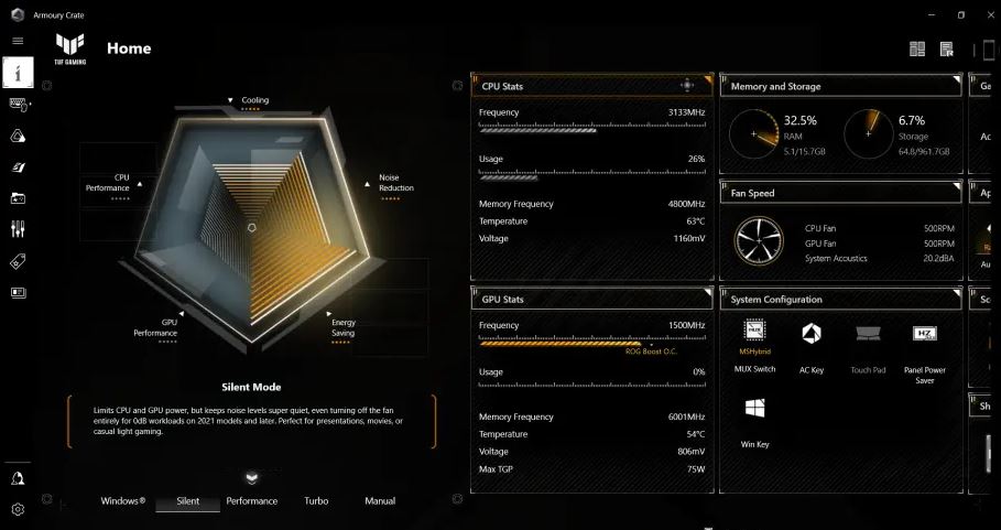 Software Armoury Crate sjednocuje ovládání systému a osvětlení do jediného, snadno použitelného nástroje. Rozsáhlé možnosti přizpůsobení umožňují nastavit si estetické efekty, vyladit herní profily a upravit nastavení zvuku podle vašich preferencí. Pomocí profilů scénářů můžete definovat a přizpůsobit předvolby, které automaticky upraví výkon a další nastavení při spuštění oblíbených aplikací a her. S Armoury Crate máte své zážitky plně pod kontrolou.