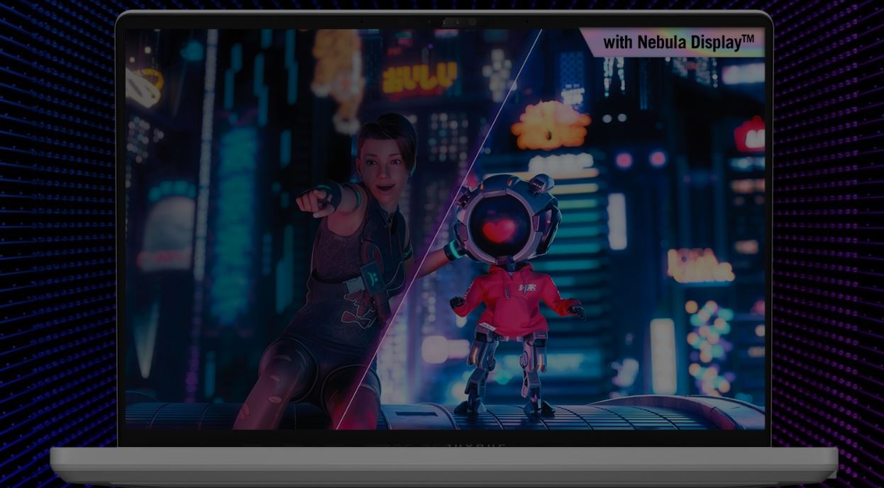 Hráčům, kteří vyžadují dokonalý pohyb a čistotu obrazu, nabízí Zephyrus G14 mimořádný displej Nebula HDR s obnovovací frekvencí 165 Hz, 100% gamutem DCI-P3 a maximálním jasem 600 nitů garantující úžasné HDR hraní. 14palcový Mini LED panel s poměrem stran 16:10 zobrazuje neuvěřitelně hlubokou černou barvu s obrazem, který přímo vystupuje z obrazovky, ať už sledujete film, nebo hrajete rychlé arénové střílečky. K dispozici jsou také varianty displeje QHD Nebula s obnovovací frekvencí až 165 Hz a maximálním jasem 500 nitů, nebo Full HD displej s obnovovací frekvencí 144 Hz. Všechny modely mají společný neuvěřitelný 91% poměr obrazovky k tělu.