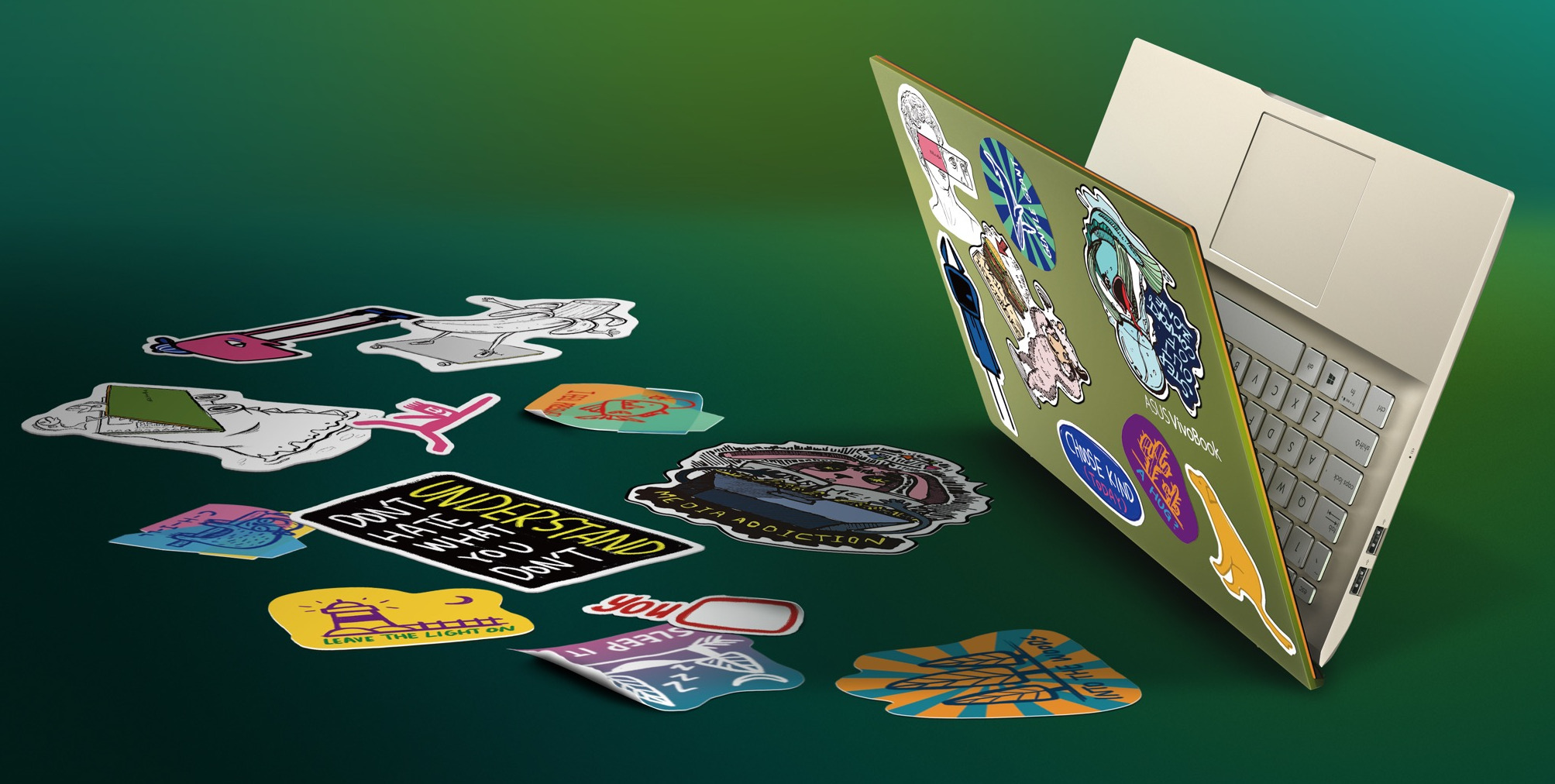 Módní stylové barvy nejsou jediným designovým prvkem. VivoBook S15 přichází se sadou jedinečných samolepek, díky nimž je váš VivoBook jedinečný. Nyní je čas na personalizaci, jaký je tedy váš styl?