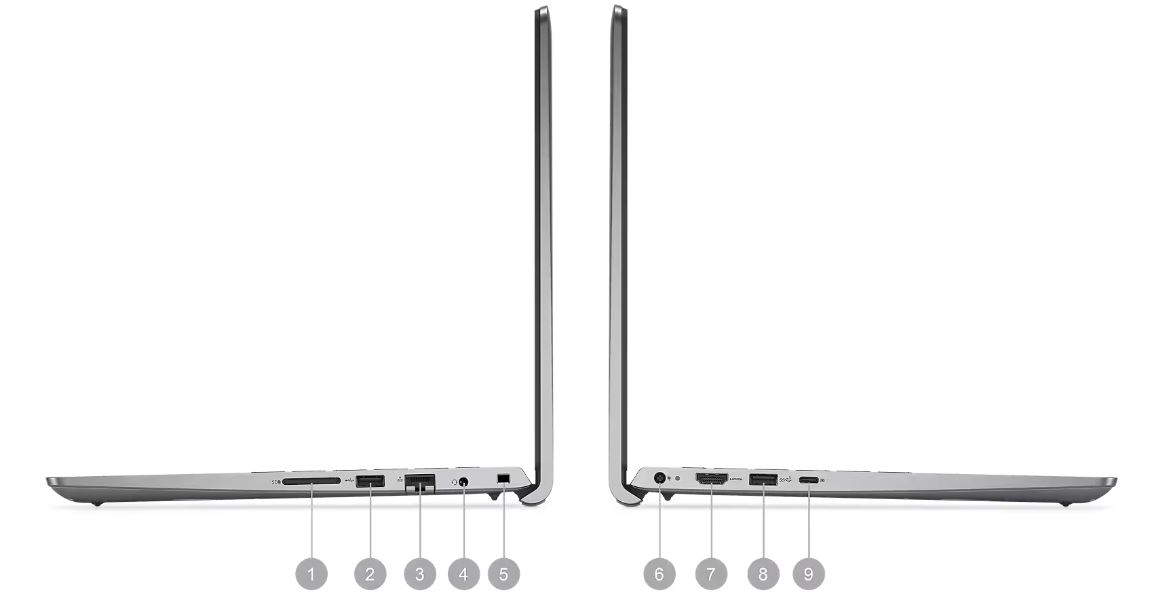 1. Slot pro kartu SD 3.0 | 2. Port USB 2.0 | 3. Port RJ-45 | 4. Konektor pro náhlavní soupravu | 5. Slot pro zámek Wedge | 6. Napájecí konektor | 7. Port HDMI 1.4 | 8. Port USB 3.2 Type-A 1. generace | 9. Port USB 3.2 Type-C 1. generace (pouze data) nebo USB 3.2 Type-C 1. generace (plné funkce)