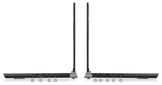 1. Sluchátka/mikrofon | 2. SS USB 3.1 Gen 1 Typ-As | 3. Thunderbolt 3 Port (USB 3.1 Gen 2 Type-C s podporou 40Gb/s) | 4. HDMI 2.0 | 5. Slot pro bezpečnostní zámek Noble | 6. napájení | 7. Gigabitový ethernet RJ-45 | 8. Port USB 3.1 SuperSpeed | 9. 2 v 1 SD / karta MicroMedia