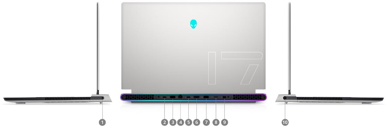 1. globální konektor pro náhlavní soupravu | 2. Type-C Thunderbolt™4 / USB 3.2 Gen 2 Port, with Power Delivery (5V/3A) | 3. Type-A USB 3.2 Gen 1 Port, with Powershare | 4. RJ-45 Killer™ Ethernet E3100 2.5G Port | 5. Type-C USB 3.2 Gen 2 Port, with Power Delivery (5V/3A) | 6. HDMI 2.1 Output Port | 7. Type-A USB 3.2 Gen 1 Port, with Powershare | 8. MicroSD Card Slot | 9. Mini Display Port 1.4 | 10. Power/DC-in Port