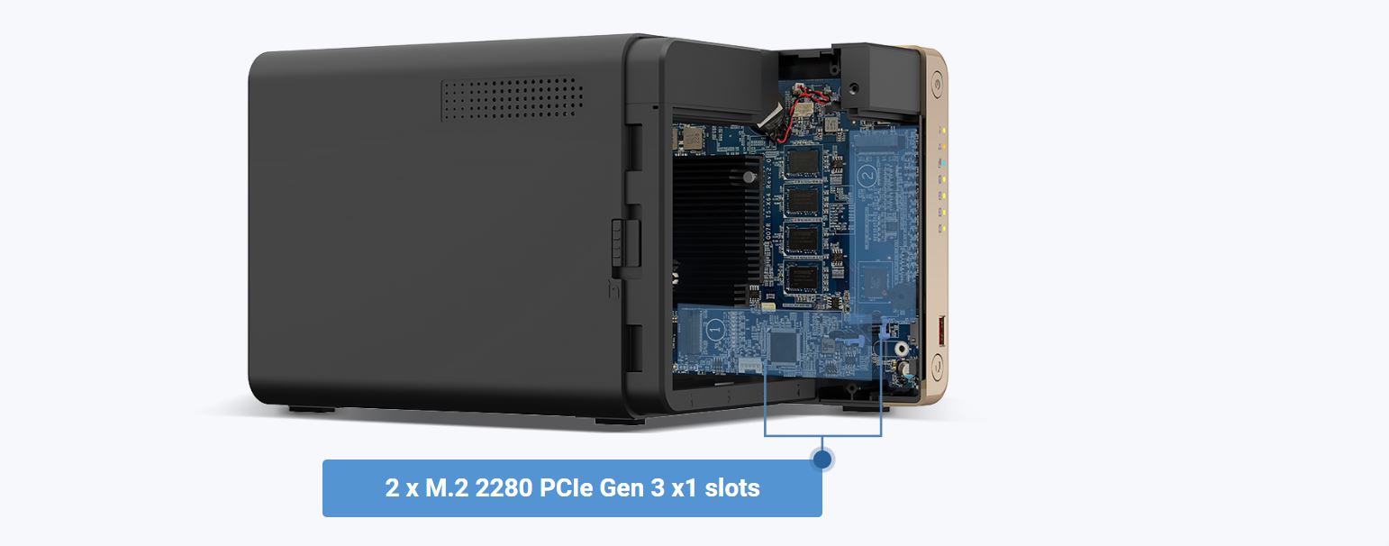 *Dva sloty M.2 PCIe Gen 3 SSD umožňují využití NVMe SSD cache nebo datových svazků SSD pro lepší výkon, nebo Edge TPU pro rozpoznávání obrázků na bázi AI.