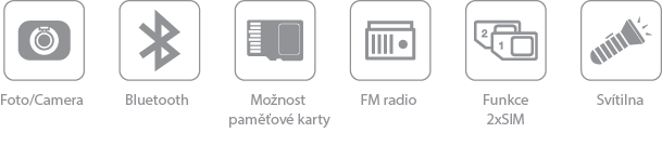 FUNKCE: Oznamovací LED kontrolka, Budík, kalkulačka , LED svítilna, FM rádio, podpora SIM toolkit,přehrávání hudby, videa, automatické nastavení času