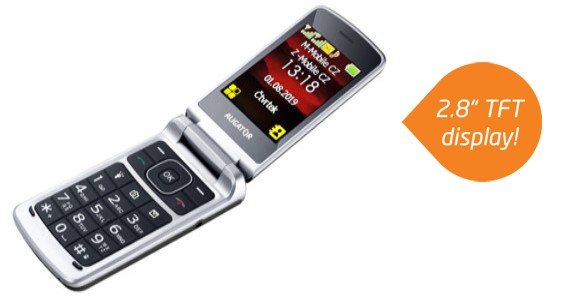 Nové, stylové „véčko“ s velkým a kontrastním displejem 2,8". Snadné ovládání, dlouhá výdrž baterie, pohodlná klávesnice, oznamovací LED kontrolka pro upozornění na zprávy a hovory.