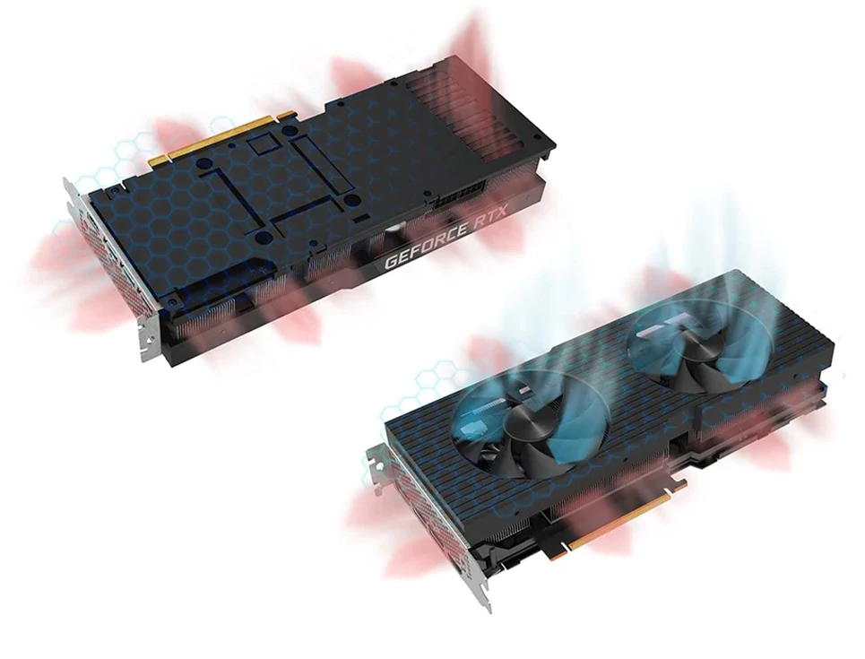 Navrženo kvůli efektivitě: Tyto vlastní konstrukce, jež jsou součástí grafických karet NVIDIA® GeForce RTX™ 3080 i 3090, mají malé nároky na prostor, maximální délku 267 mm zahrnující 2,5násobek slotu a 2 6kolíkové/8kolíkové napájecí konektory PCI-Express. Všechny tyto možnosti vznikly s cílem vytvořit efektivitu a nekompromisní herní výkon.
