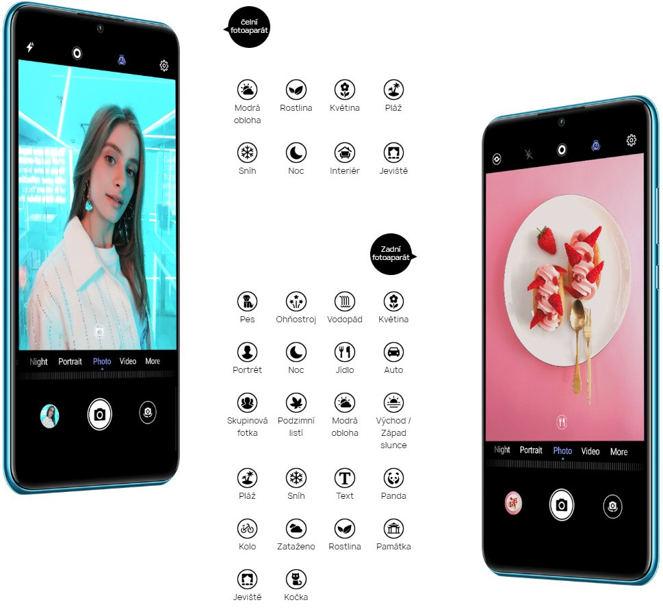 Vylepši svoje fotografie díky AI technologii rozpoznání scény. Čelní fotoaparát HUAWEI P30 lite dokáže identifikovat až 8 kategorií scén v reálném čase a zadní fotoaparát dokonce 22 různých kategorií. Nastavení jako vyvážení barev, světla a úroveň kontrastu se nastaví automaticky, aby byl každý snímek oslnivý.