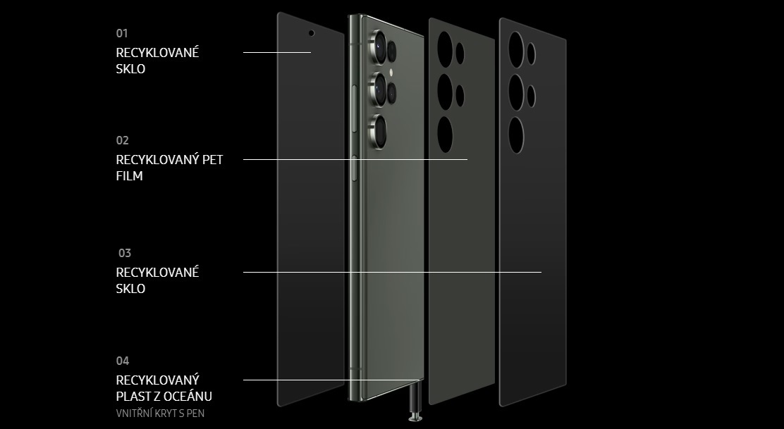 Náš nápadný symetrický design Galaxy S Ultra se vrací s jedním zásadním rozdílem – recyklovanými a k životnímu prostředí přívětivými materiály. Od repasovaného skla až po barvu leštěného kovového rámečku, v této podobě se krása stává přirozeností.
