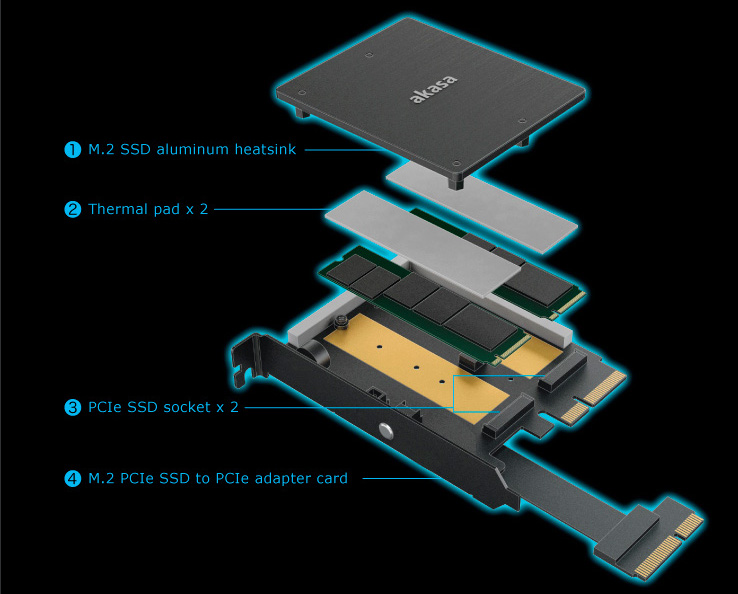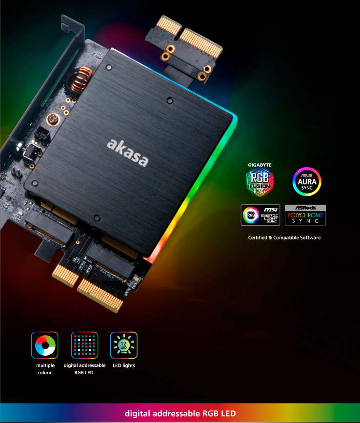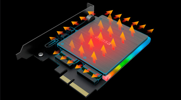 Tento adaptér převádí dva disky M.2 PCIe SSD tak, aby fungovaly v hlavní desce sběrnice PCIe x4, snižuje teplo SSD, přidává digitální adresovatelnou barvu RGB