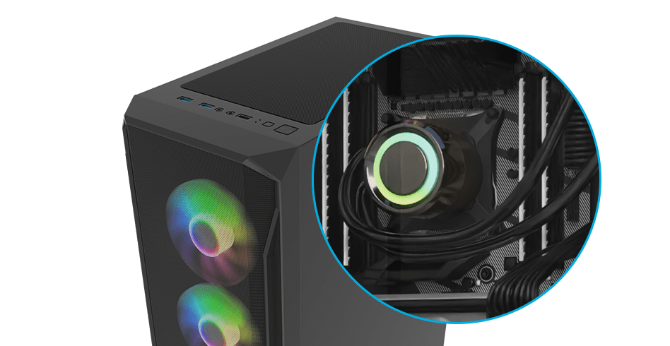 V kombinaci s možností instalace vzduchového chladiče procesoru o průměru až 161 mm a celkem až osmi ventilátorů (3× vpředu, 2× nahoře, 1× vzadu, 2× dole) získáte velmi účinný systém chlazení, který si poradí s opravdu výkonnými komponenty. Nadšenci extrémního výkonu se mohou spolehnout také na kompatibilitu s integrovanými systémy kapalinového chlazení AIO.