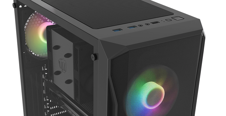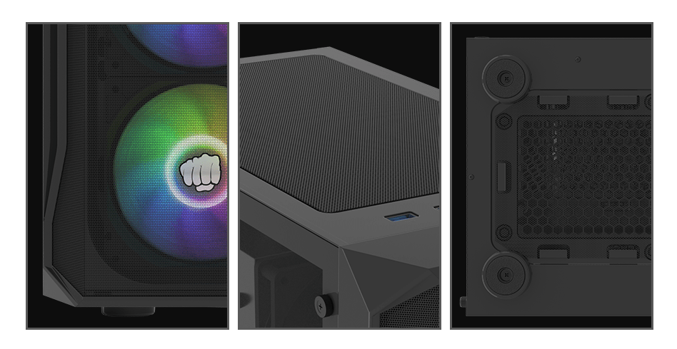 Postavte zvíře, ne počítač! Díky 4 výkonným 120mm ventilátorům RGB (jeden vzadu, tři vpředu) a otevřené horní části a síťované přední části zajišťuje Shobo SH4F RGB neomezené proudění vzduchu skříní.