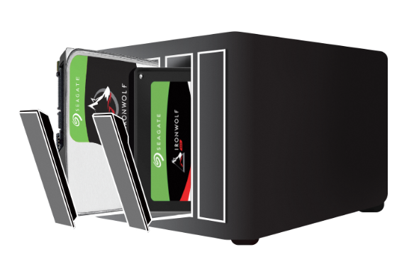 Portfolio IronWolf zahrnuje pevné disky a SSD pro systémy NAS. IronWolf 110 SSD může být integrován pro ukládání do mezipaměti na kompatibilním NAS, jako je QNAP TVS-951X. Mít hybrid HDD a SSD umožňuje ukládání do mezipaměti, což poskytuje maximální kapacitu, minimální náklady a optimální výkon.