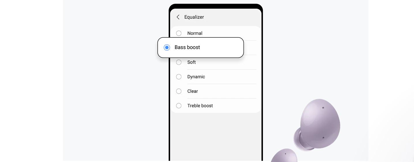 Každý poslechový zážitek je s Galaxy Buds2 přizpůsoben vašim potřebám. S 6 odlišnými možnostmi nastavení ekvalizéru snadno naleznete perfektně prokreslený zvuk, který vás doslova pohltí.