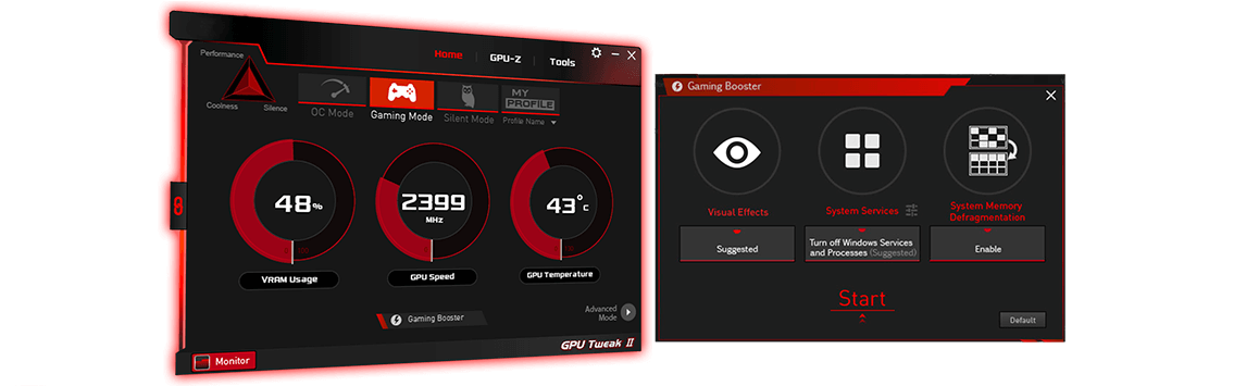 Nástroj ASUS GPU Tweak II posouvá ladění výkonu grafické karty a na další úroveň. Umožňuje vám vyladit kritické parametry včetně hlavní GPU frekvence, frekvence paměti, nastavení napětí a další s možností sledovat vše v reálném čase prostřednictvím přizpůsobitelného zobrazení na obrazovce. GPU Tweak II nabízí všechny nástroje od jemného ladění výkonu až po pokročilé ovládání ventilátoru. Umožňuje vám tak z vaší grafické karty získat skutečné maximum.