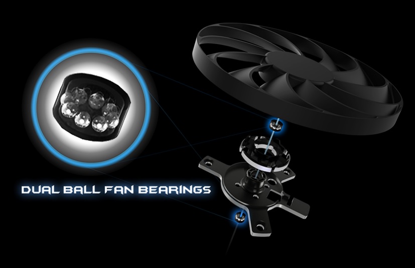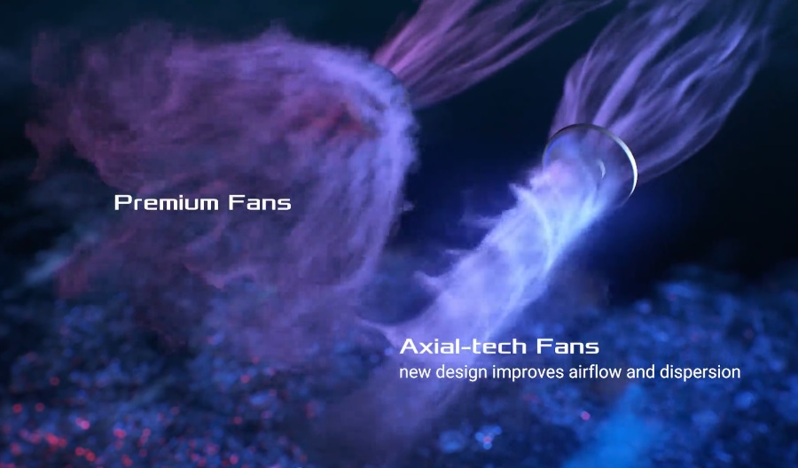 Dva osvědčené ventilátory Axial-tech mají menší náboj, který umožňuje delší lopatky, a bariérový kroužek, který zvyšuje tlak vzduchu směrem dolů.