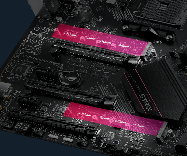ROG Strix B550-XE Gaming WIFI je vybaven dvěma integrovanými sloty M.2, z nichž jeden podporuje nejnovější standard PCIe 4.0 s maximální flexibilitou úložiště a nejvyšší rychlostí dat, jaké jsou běžně k dispozici pouze u nejnovějších procesorů AMD Ryzen. Oba sloty M.2 podporují až patici typu 22110 a NVM Express® RAID, aby mohly poskytovat vyšší výkon.