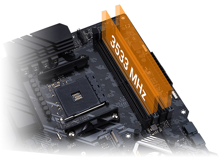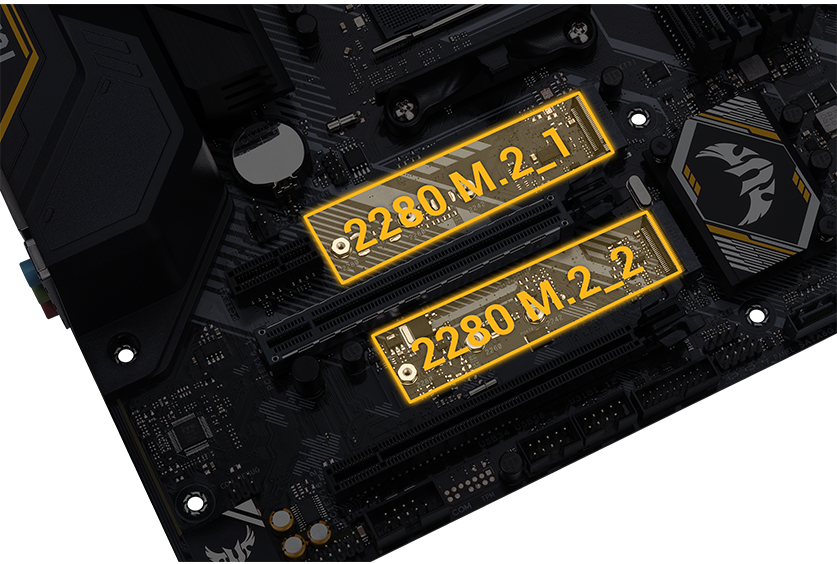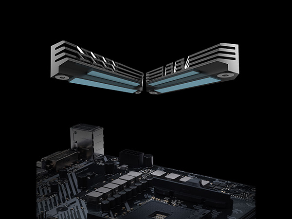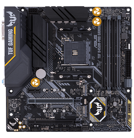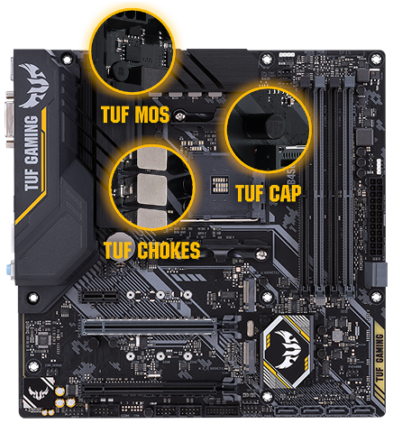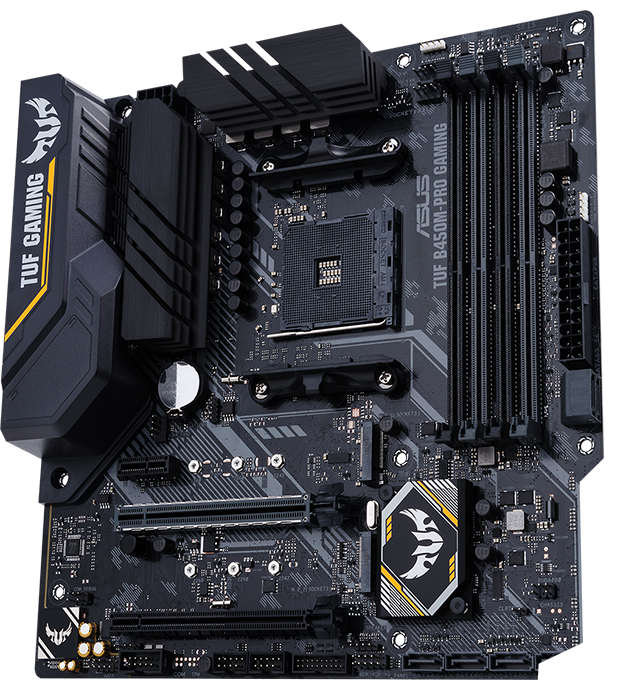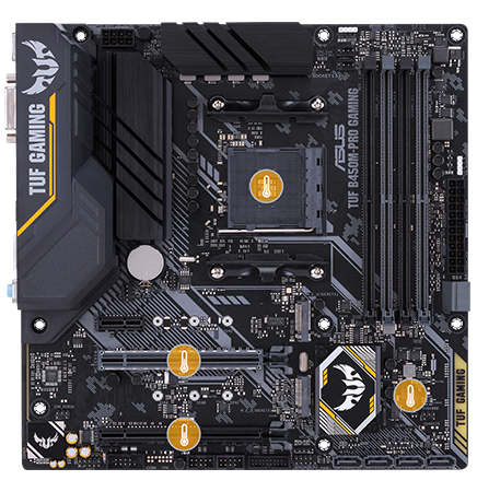 TUF B450M-PRO GAMING má vylepšený VRM a chladič pro zlepšení chlazení. Nové tlumivky ze slitin poskytují vyšší výkonovou konverzi, nižší rozptyl výkonu a lepší regulaci teploty pro efektivnější provoz. Vylepšené ladění napětí dále zvyšuje výkon. Optimalizované uspořádání VRM a větší chladič VRM s většími tepelnými vložkami, které nabízejí lepší vodivost, zvyšují odvod tepla, pomalejší nárůst teploty a lepší celkovou účinnost chlazení.