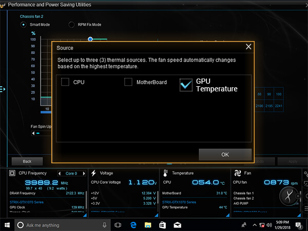 Díky systému Fan Xpert 2+ můžete ovládat systémové ventilátory na základě vstupů až ze tří tepelných zdrojů. Fan Xpert 2+ může být například nastaven tak, aby otáčel systémové ventilátory dle teploty GPU. Takže pokud vám vaše hra zatopí pod kotlem, zvýší se chladící výkon – přesně tak, jak právě potřebujete. Vyberte tepelný zdroj a prahové hodnoty základní desky, CPU či GPU a zbytek zařídí nástroj Fan Xpert 2+.