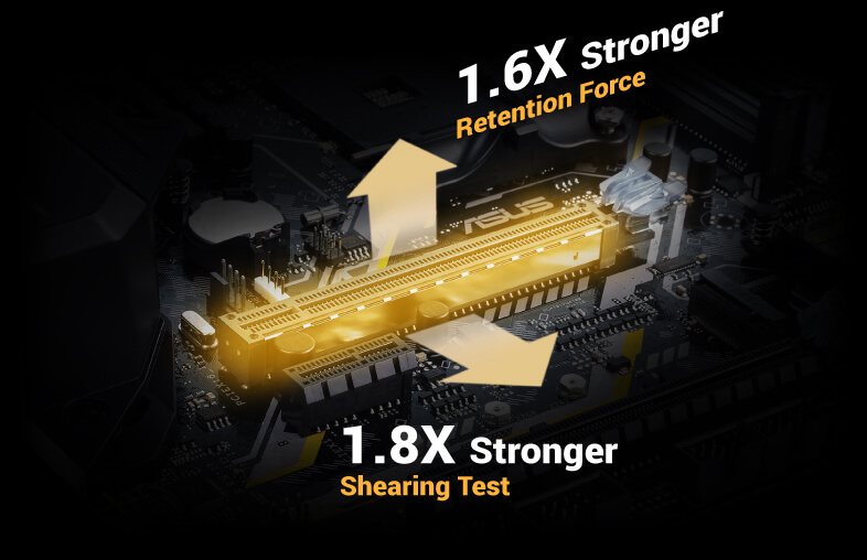 SafeSlot je slot PCIe® přepracovaný společností ASUS tak, aby poskytoval špičkovou retenci a odolnost proti ulomení. Slot byl vyroben v jediném výrobním kroku s využitím nového procesu vstřikování plastů pro upevnění slotu k ochrannému kovu. Výsledkem je odolnější slot, který je následně pevně ukotven k desce tištěnými spoji (PCB) pomocí dalších pájecích bodů. .