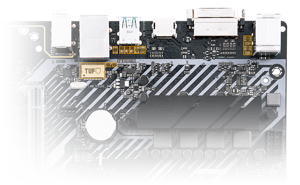 TUF LANGuard je inovace na úrovni vojenských řešení, která integruje pokročilou technologii spojování signálu a špičkové kondenzátory osazené na desce plošných spojů pro zlepšení propustnosti, ochrany základní desky před údery blesku a statickou elektřinou.