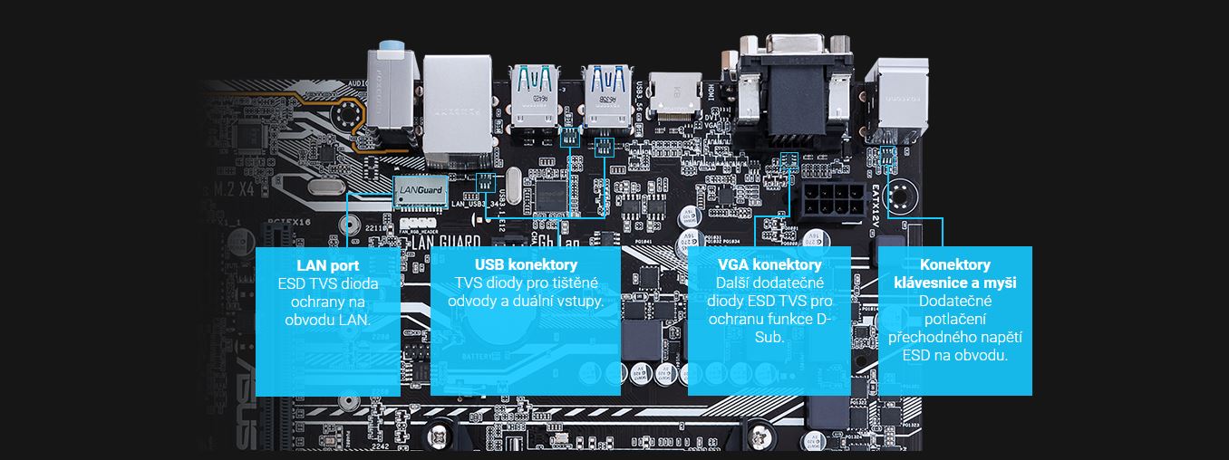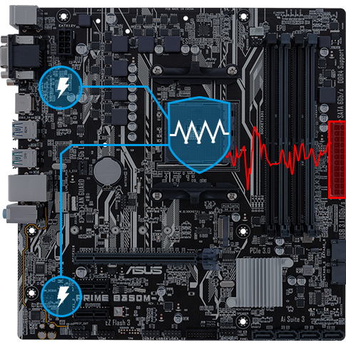 Ochranné prvky ASUS ESD Guards jsou schopny odolat +/- 10 kV v případě vzduchového výboje a +/- 6 kV v případě kontaktního výboje. Využíváme aktivní ochranné obvody, které chrání váš systém před elektrostatickým rušením a poškozením, čímž zaručují delší životnost komponent.