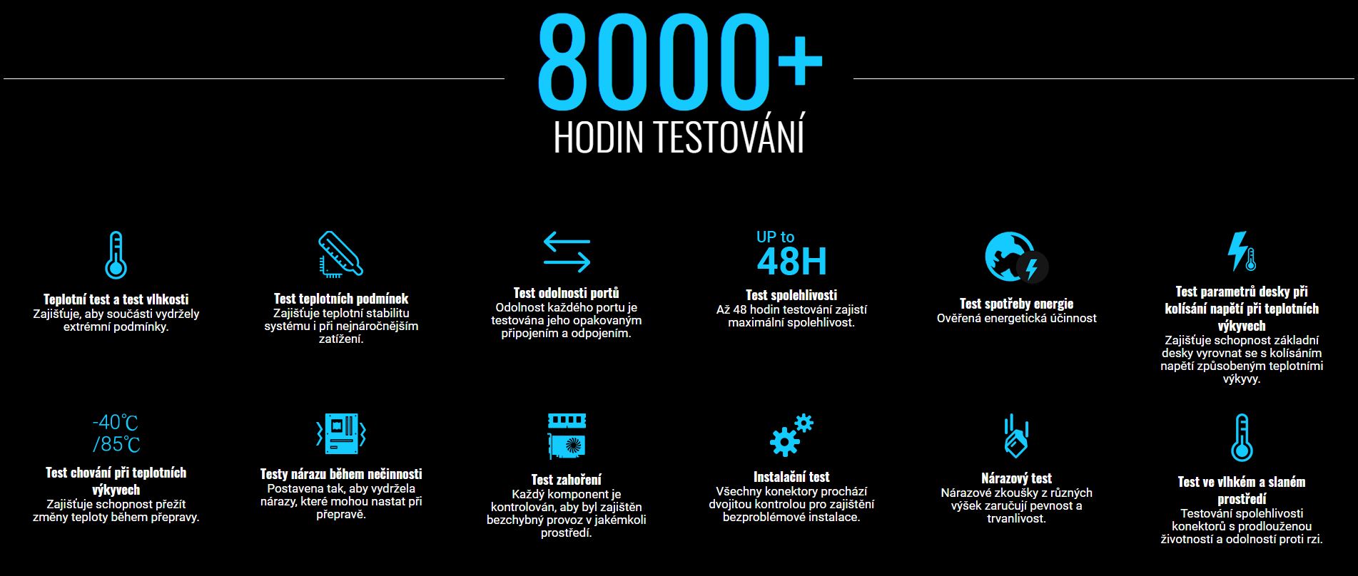 Základní desky ASUS se pyšní vynikající odolností. Každá deska je podrobena více než 8000 hodinám přísných testů. Testy zahořením, testy životního prostředí, testy kompatibility, softwarové testy a bezpečnostní testy potvrzují, že naše desky jsou mimořádně stabilní. Naše testy jsou ve svém odvětví jedinečné a přísnější než průmyslové standardy. Chceme si totiž být jistí, že každý náš produkt je zkonstruován tak, aby fungoval bezchybně v každém prostředí.