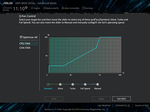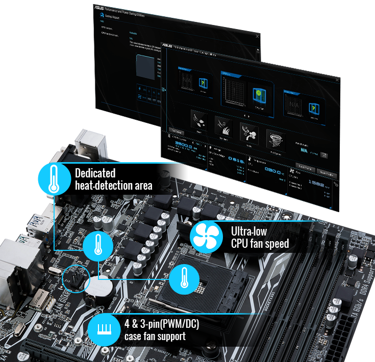 Exkluzivní nástroj Fan Xpert zajišťuje pro každý ventilátor nejlepší možný poměr mezi chladicím výkonem a hlučností. U řady základních desek Prime A320 s hardwarovým 4-pinovým/3-pinovým PWM/DC režimem pro ventilátor skříně, můžete jednoduchým nastavením v BIOSu používat váš skříňový ventilátor v režimu PWM/DC. Fan Xpert dokonce obsahuje režim automatického ladění, který oskenuje a odhalí všechny charakteristiky ventilátoru potřebné pro nastavení jediným kliknutím.
