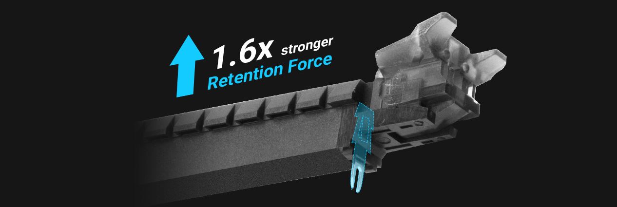 Stačí pouze lehce stlačit velkou lamelu Q-Slotu, a grafická karta vyskočí sama! Instalace nebo demontáž grafických karet se tak obejde bez jakékoliv námahy!