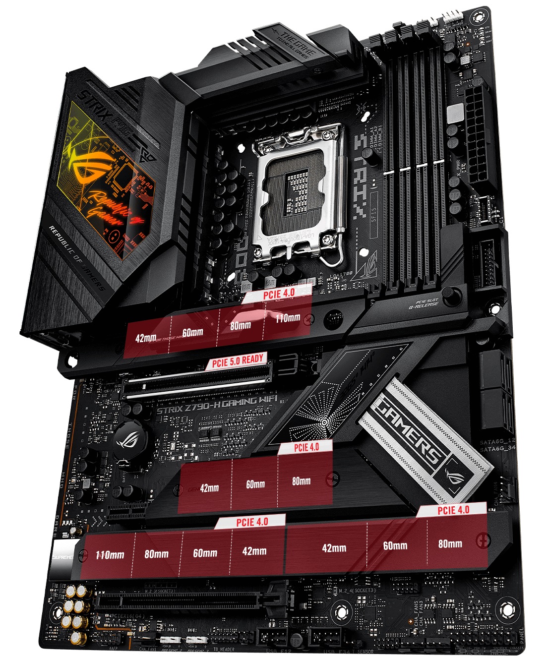 Strix Z790-H přidává do svého arzenálu podporu PCIe 5.0 s rozšiřujícím slotem x16, který je chráněn držákem SafeSlot, aby unesl hmotnost nejnovějších grafických karet.