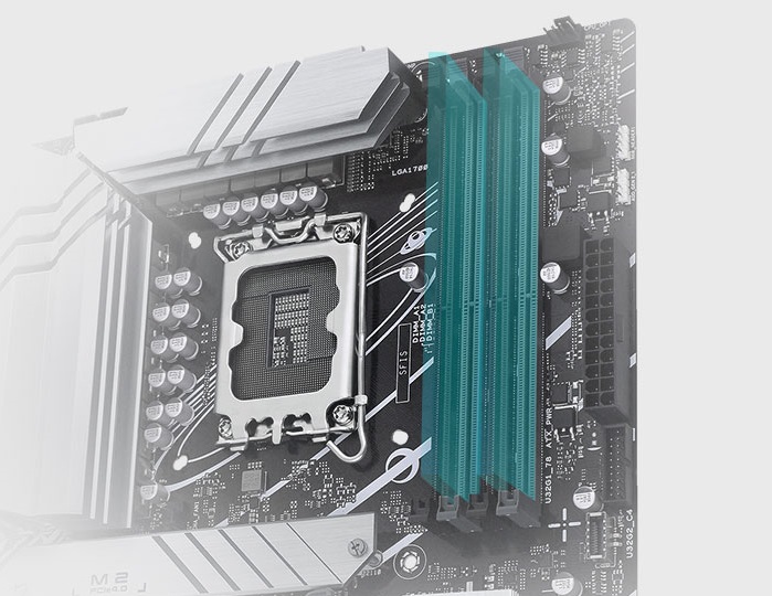 Revize trasování základní desky poskytuje nejnovějším procesorům Intel neomezený přístup k šířce paměťového pásma. Technologie ASUS OptiMem II pečlivě mapuje cesty paměťových signálů napříč různými vrstvami PCB, čímž redukuje průchody a přidává stínicí zóny, které výrazně snižují přeslechy.