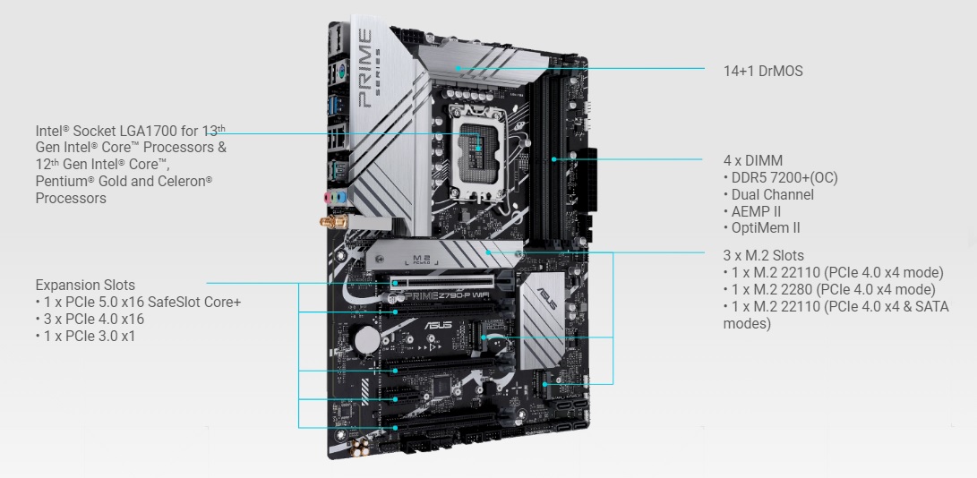 Základní desky ASUS řady Prime jsou odborně navrženy tak, aby naplno využily potenciál procesorů Intel Core 13. generace. PRIME Z790-P WIFI se může pochlubit robustní napájecí konstrukcí, komplexním řešením chlazení a možnostmi inteligentního ladění a poskytuje uživatelům a stavitelům počítačů pro kutily řadu optimalizací výkonu prostřednictvím intuitivních funkcí softwaru a firmwaru.
