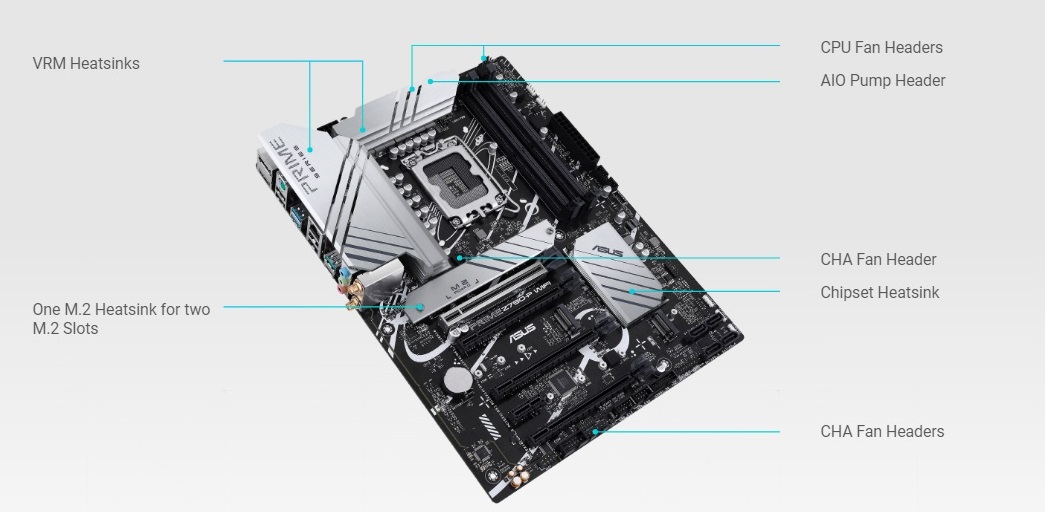 PRIME Z790-P WIFI je vybavena komplexním ovládáním chlazení, které lze konfigurovat pomocí softwaru Fan Xpert 4 nebo prostřednictvím systému UEFI BIOS.