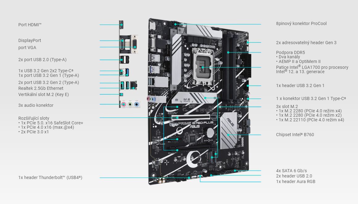 Deska PRIME B760-PLUS je konstruována tak, aby zvládala vysoké počty jader a nároky na šířku pásma procesorů Intel® Core™ 13. generace. Základní deska ASUS B760 nabízí všechny nezbytné funkce pro zvýšení každodenní produktivity. Váš systém bude připraven k akci díky stabilnímu napájení, intuitivnímu chlazení a flexibilním možnostem přenosu dat.