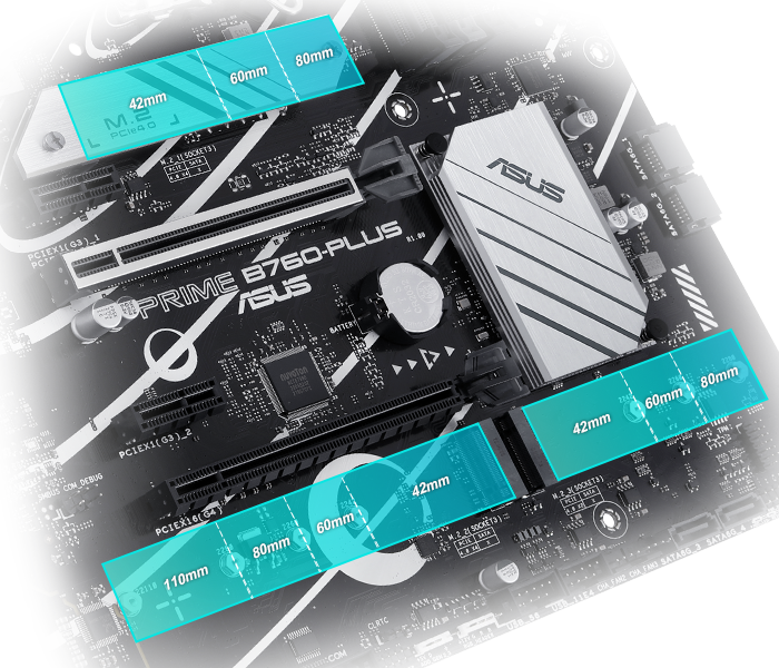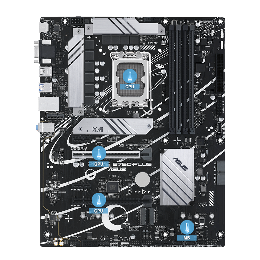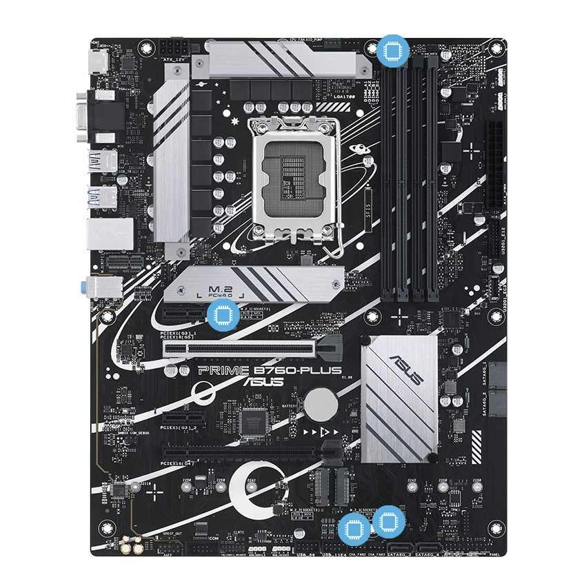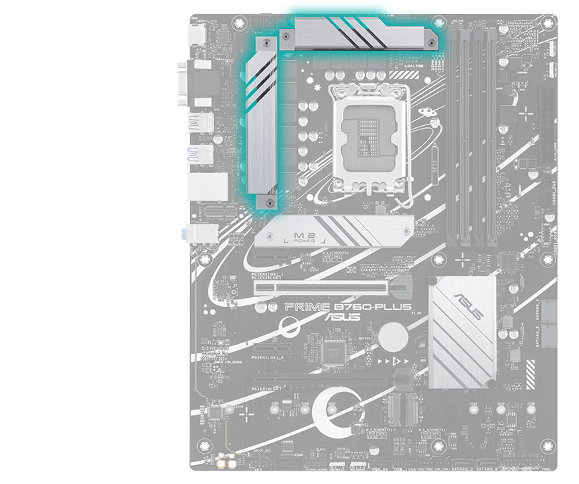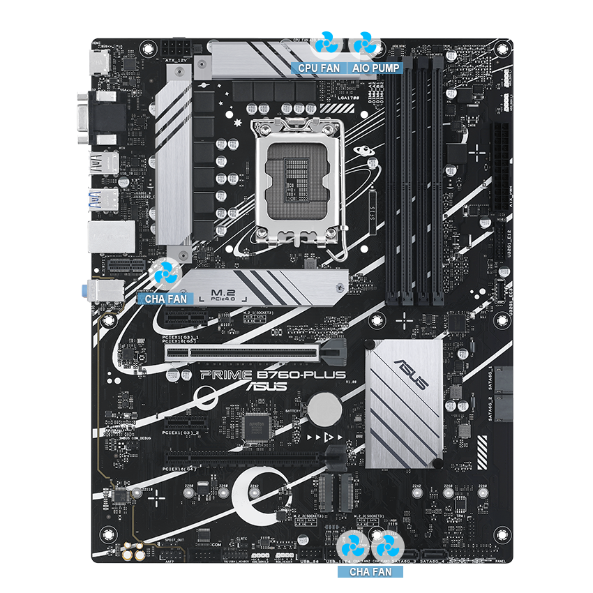 Základní deska PRIME B760-PLUS je vybavena několika integrovanými chladiči a řadou headerů hybridních ventilátorů, které zajistí, že vaše sestava zůstane i při intenzivní zátěži dostatečně chladná a stabilní.