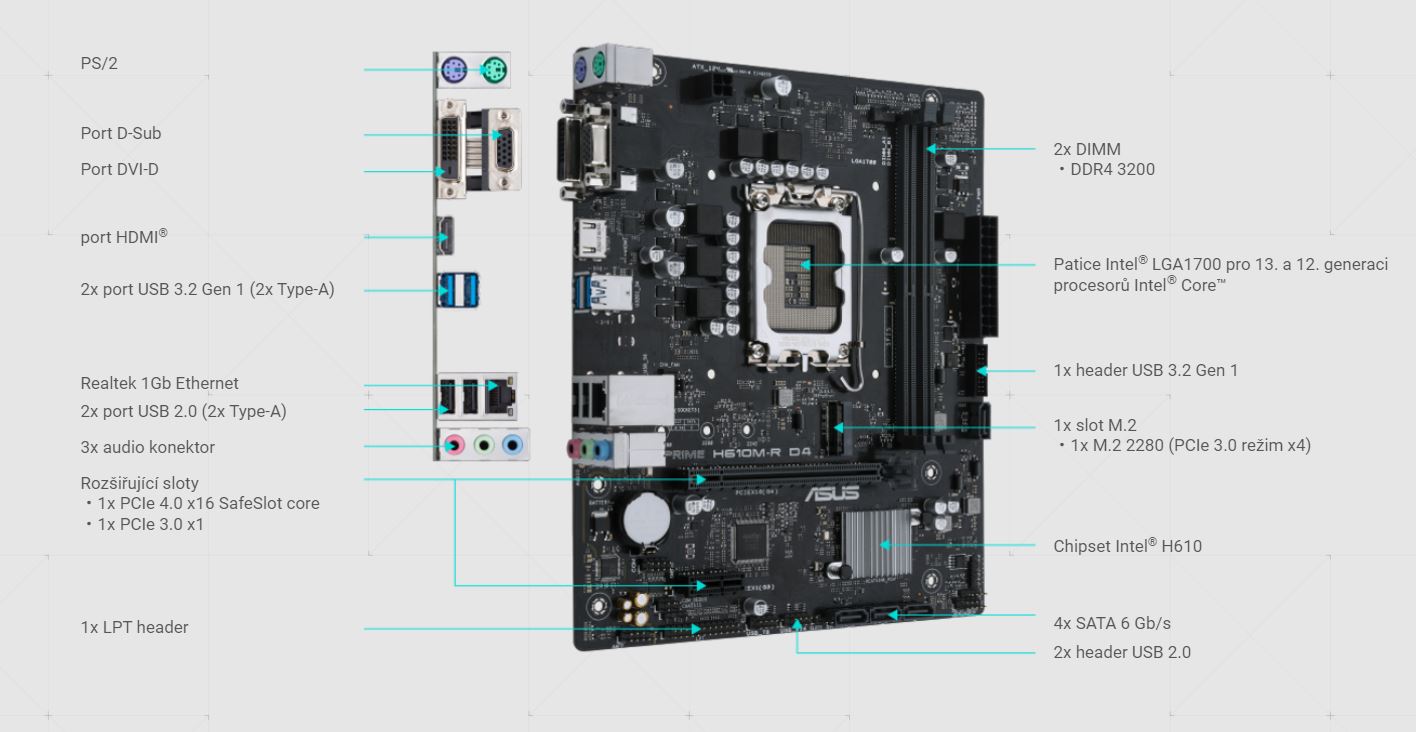 Produkty společnosti můžeme nalézt téměř ve všech odvětvích trhu s IT.Produkt ASUS PRIME H610M-R-SI / LGA 1700 / mATX se nachází v kategorii Intel 1700, výrobce ASUS